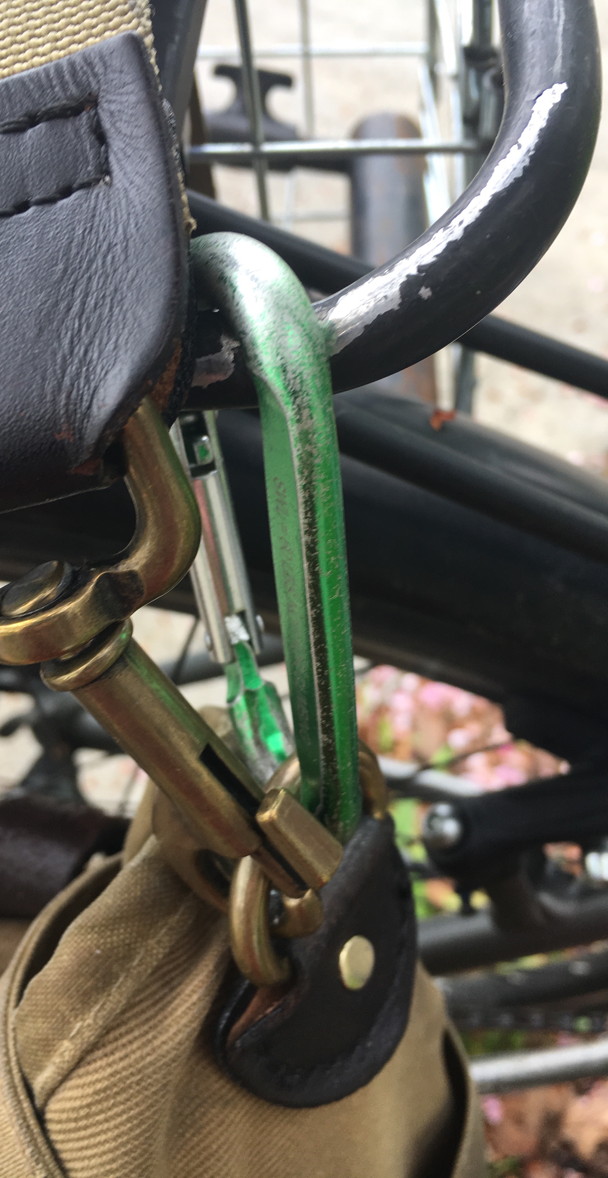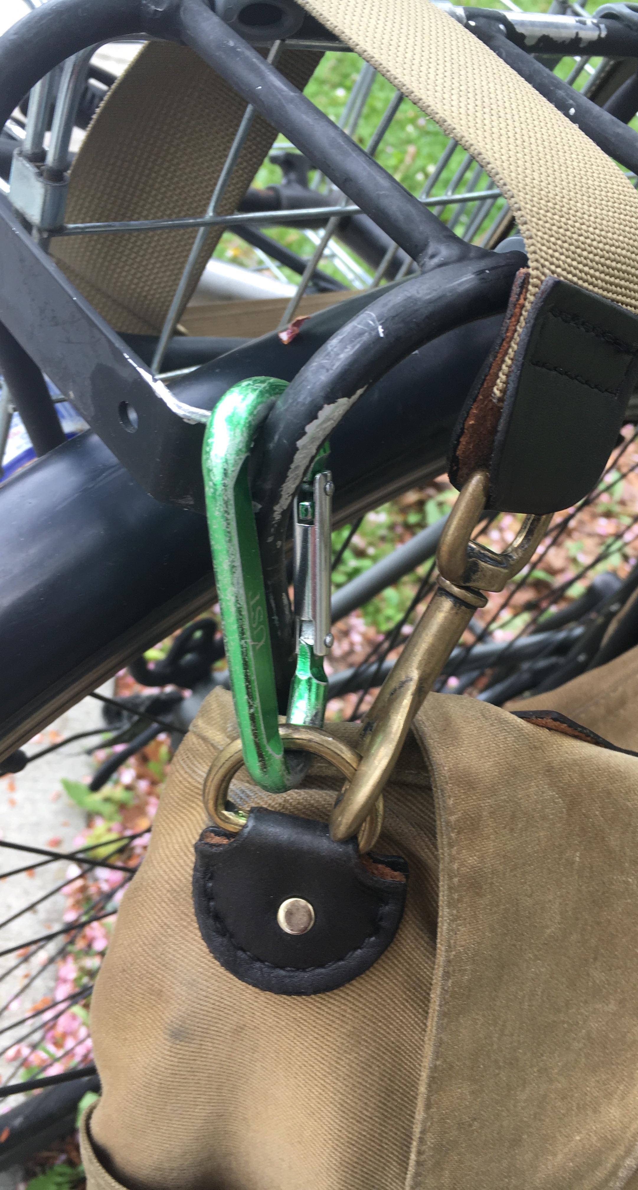 Now when I get where I’m going, I can unhook the carabiners, and I have a shoulder bag to carry with me.